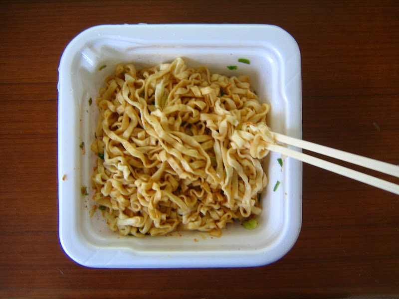 Miután az ember megszabadítja a színes fóliától, analfabétáknak és teljes konyhai antitalentumoknak is érthető használati utasítás látható a dobozon. Nemcsoda, hogy gyakran veszek ilyet :) Tető alatt lapul pár zacskó (szárított zöldség, fűszerek, szósz). Ezeket az ember rászórja a tésztára (a szószt nem) és már adhatja is hozzá a forró vizet. A tetőt visszahajtva kivárjuk a megfelelő időt (3-5 perc, tésztája válogatja), aztán következik a nekem legjobban tetsző megoldás: föltépi az ember az ellentétes sarkon a borítást, ahol egy szűrő van és leönti a fölösleges vizet. Jöhet a szósz és kész is az ebéd.