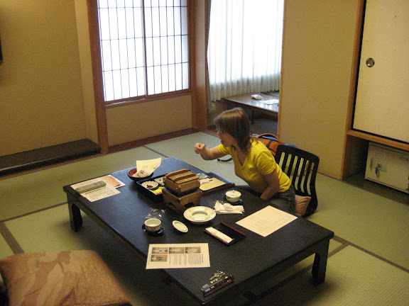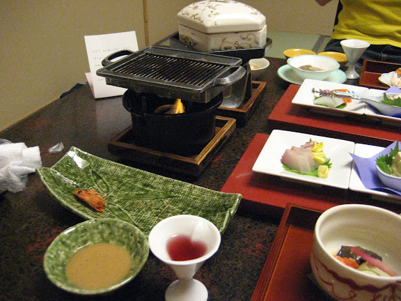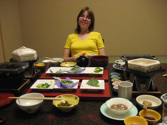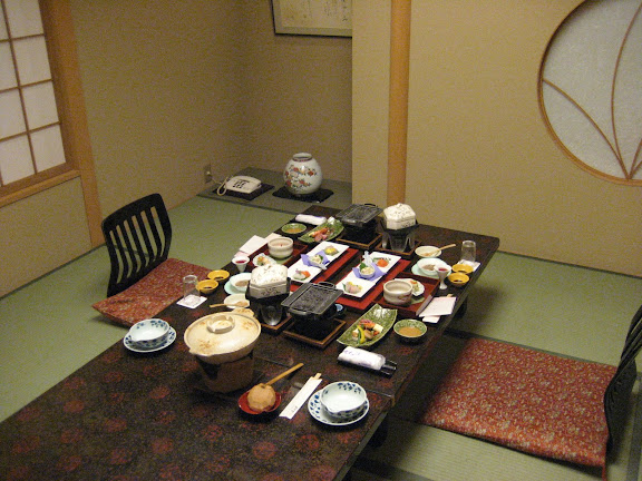 A vacsoráig, ami este hétkor volt, ismerkedtünk a szobánkkal és körbejártuk a hotelt is. Ez egy fürdőszálló, rengeteg különböző típusú forró fürdővel. Akár sajátot is lehet bérelni ötven percre. (Ez kimaradt mert érdeklődésünk a forró fürdőzés iránt nem volt egyforma :) ). Nagyon gyorsan eltelt az idő és már mehettünk is vacsorázni. Amikor beléptünk a számunkra fenntartott szobába ez a látvány fogadott. És ez még csak a kezdet volt! Volt "étlap" illetve leírás arról, hogy miket is eszünk, de persze csak japánul, sokat nekünk nem segített. A már korábban megismert hölgy hozta be az újabb és újabb edényeket. Meg noszogatott minket, hogy melyiket melegítsük, melyiket együk gyorsan, mert kiszárad, stb. Lehet hogy tudott angolul, de jól titkolta, amikor nagy bajban voltunk azért egy-két szót szólt angolul is.