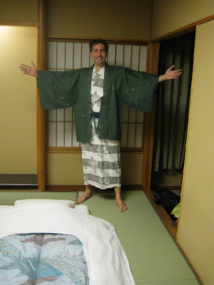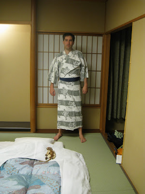 A szobához tartozott szép méretes hűtőszekrény, mosdó és vécé, vízmelegítő termosz, teáskészlet, valamint yukata, övvel és meleg felsővel és természetesen papucs. A yukata egy nyári kimonónak is nevezett hosszú köntös jellegű ruhadarab. Fürdőkben előszeretettel hordják férfiak, nők is. Sokkal egyszerűbb ruhadarab mint a kimonó és sokszor csak hétköznapi övvel rögzítik, nem a bonyolult obival. De ez egyébként is egy szolidabb fürdőköpeny jellegű ruhadarab. Mellesleg az egyiknek méretes lyuk volt a fenekénél, ami azért egy ennyire elegáns szállodában, meglepő volt. Mindenesetre másnap reggel, amikor eljöttünk úgy terítettem ki az matracra, hogy egyből lássa a takarító személyzet, mi a "hézag".