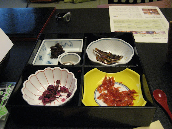 Előző napi kellemetlen tapasztalatunk miatt óvatosan haladtunk és megkérdeztünk egy eladó hölgyet is, hogy tényleg jó irányba megyünk-e. A hotel kívülről nem volt valami szép, de valószínűleg azért is éreztük így, mert közvetlen környezetében egy bontásra ítélt elhagyatott épület állt. Belépve viszont süppedős szőnyeg és (már amennyire én meg tudom ítélni) ötcsillagos recepció fogadott. Természetesen (mint utazásunk alatt eddig bármikor egyébként!) egyből tudták kik vagyunk és mit rendeltünk. Kaptunk egy angol nyelvű leírást, kiválaszthattuk mikor szeretnénk vacsorázni és reggelizni, majd egy kimonós "szobalány" elkísért minket a szobánkhoz, ahol egyből teát is szervírozott nekünk. Az asztalon volt pár ropogtatni való, aminek én természetesen nem tudtam ellenálni. Legfinomabb az enyhén édeskés kis halacskák voltak.