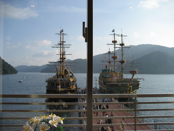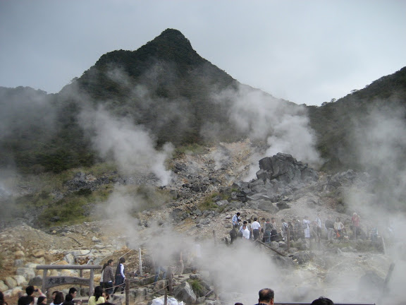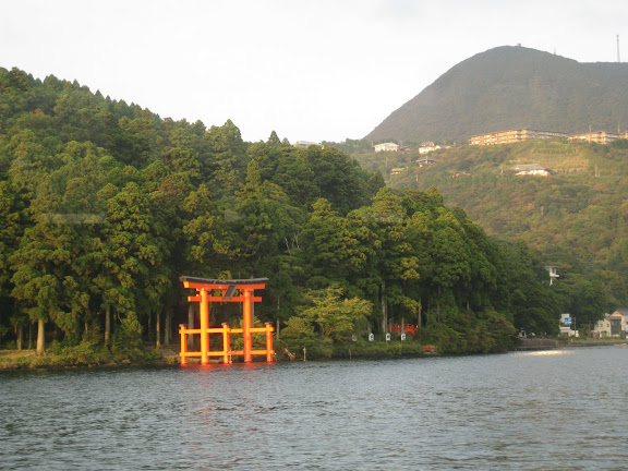 Ezekután következett a sikló Sounzanba, majd itt libegőre szálltunk. Sajnos a Fuji nem látszott annyira szépen mint márciusban, de aki tudta, hogy hova nézzen és mit keressen a tekintetével az kiszúrhatta. Elnézve, hogy szinte csak mi fényképeztük, nem sokan vehették észre. Természetesen beszagoltunk a kénes, büdös, vulkanikus bugyogó iszapforrásokhoz is Owakudaninál. Tovább libegtünk Togendaiig, de hajóra szállás előtt ebédelő helyet kerestünk. Szerencsére nem nagyon kellett keresni, mert egy hatalmas étterem van az egybeépült libegő és hajóvégállomáson. Egyszerű önkiszolgáló a hely, nem túl nagy kínálattal. De úgy látszik amit kínálnak az első osztályú. Mind a spagetti, mind a curry friss és ízletes volt. Én nem nagyon szeretek curryt kérni, mert az intézet kantinjában nem igazán nyerte el tetszésemet, de úgy tűnik lehet azt sokkal jobban is elkészíteni! Az evés közben elénk táruló kilátás az Ashi tóra és az épp érkező-induló hajókra pedig megkoronázta a késői ebédünket.A hajón próbáltunk nézelődni, de a tele has megtette a hatását. Még szerencse, hogy időben felébredtünk és a tóban álló toriit sikerült lefényképeznünk. Mire kikötöttünk már el is kezdett sötétedni, úgyhogy egyenesen a buszmegállóhoz mentünk. Itt volt egy kis szervezési probléma: mindenkit az expressz busz megállójába tereltek, de közben befutott a lassabb busz is, ami előbb indult, úgyhogy inkább azzal mentünk. Sajnos az út utolsó szakaszán jó nagy dugóba kerültünk, viszont a gyorsabb járatú busz a közös szakaszon sem ért utol minket, szerintem jól döntöttünk.