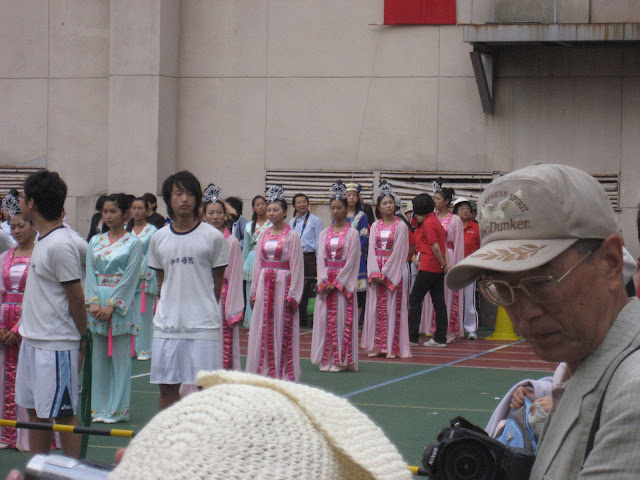 Sajnos az ebédlő ahova beültünk, nem volt túl sikeres választás. Akkor még csak azt gondoltuk, hogy még középszerűnek sem mondható étel túlontúl drága volt, sajnos az éjszaka folyamán kiderült nekem nagyobb gondjaim is voltak a menüvel. Egy előnye viszont kétségkívül volt a helynek, nagyon jó kilátás nyílt az iskola egyik kapujára, ahonnan is egyszercsak elkezdtek a tömegek kivonulni. Volt ott minden, nyitott amerikai kocsiban szépségkirálynő választás három helyezettje, mazsorettek, petárda, öltönyös szigorú nagy-emberek, zenekar, különböző koreográfiára táncoló iskolások színes ruhákban (néha bizony egy csoporton belül is úgy tűnt, hogy több táncformációt mutatnak be) és "hátul busa fejét rázogatva az élő orosz egyház "- najó az nem :) A hallgatóság tagjai taiwani zászlókat lobogtattak és mi abszolút értetlenül álltunk az ünneplés előtt. Mindenestre kaptunk mi is zászlót.